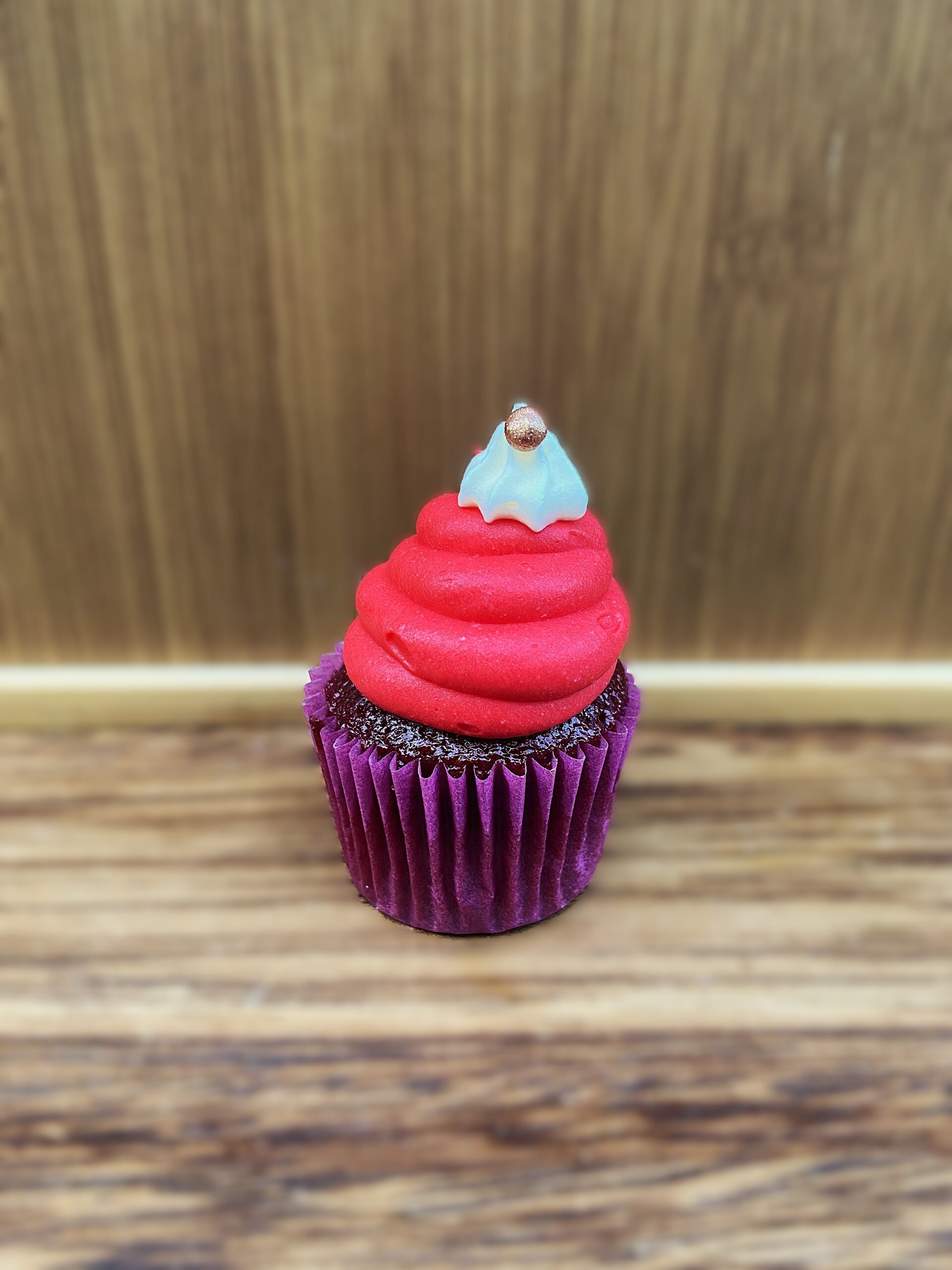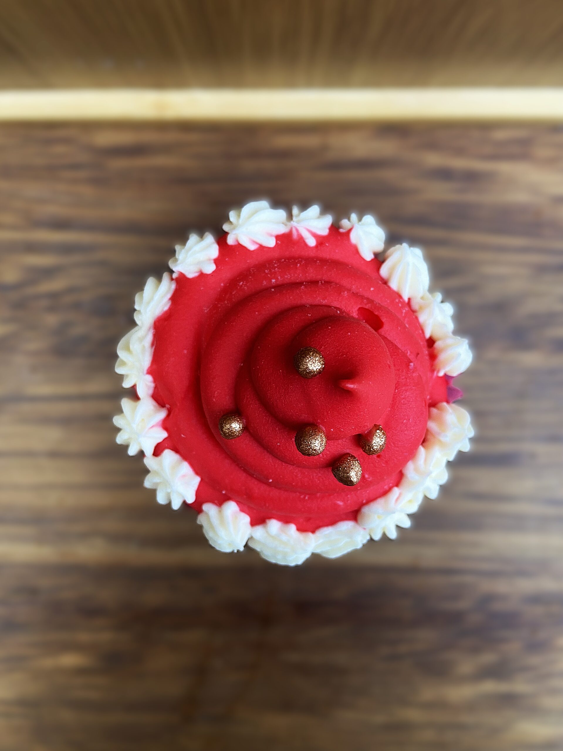 Sublime cupcake de Noël red velvet – Un petit plaisir frais et gourmand ! Moelleux à souhait, garni d’une crème vanillée.