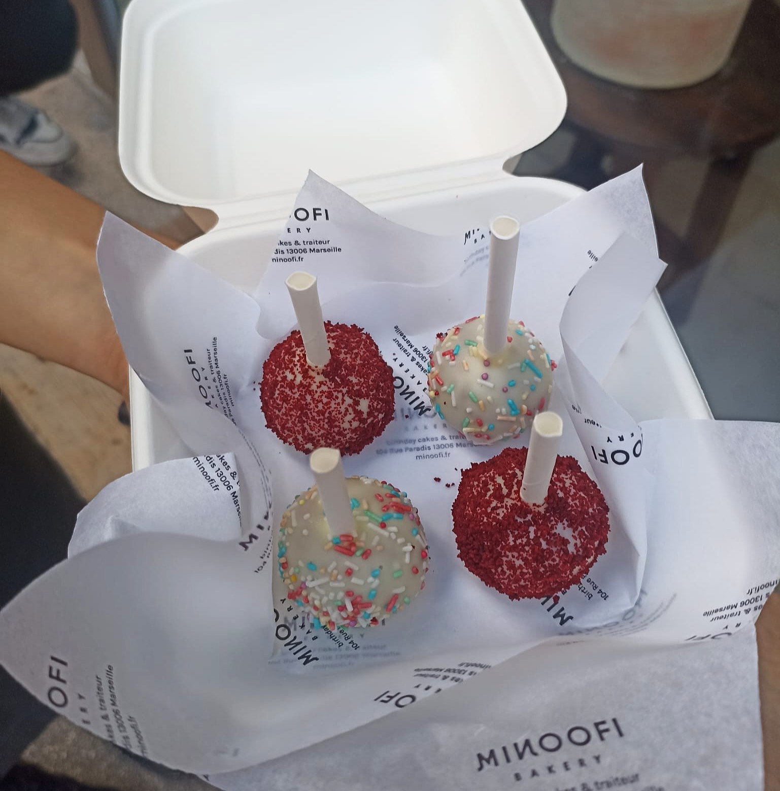 4 popcakes redvelvet couvert de chocolat blanc parsemé de rouge ou multicolores ! 12€
