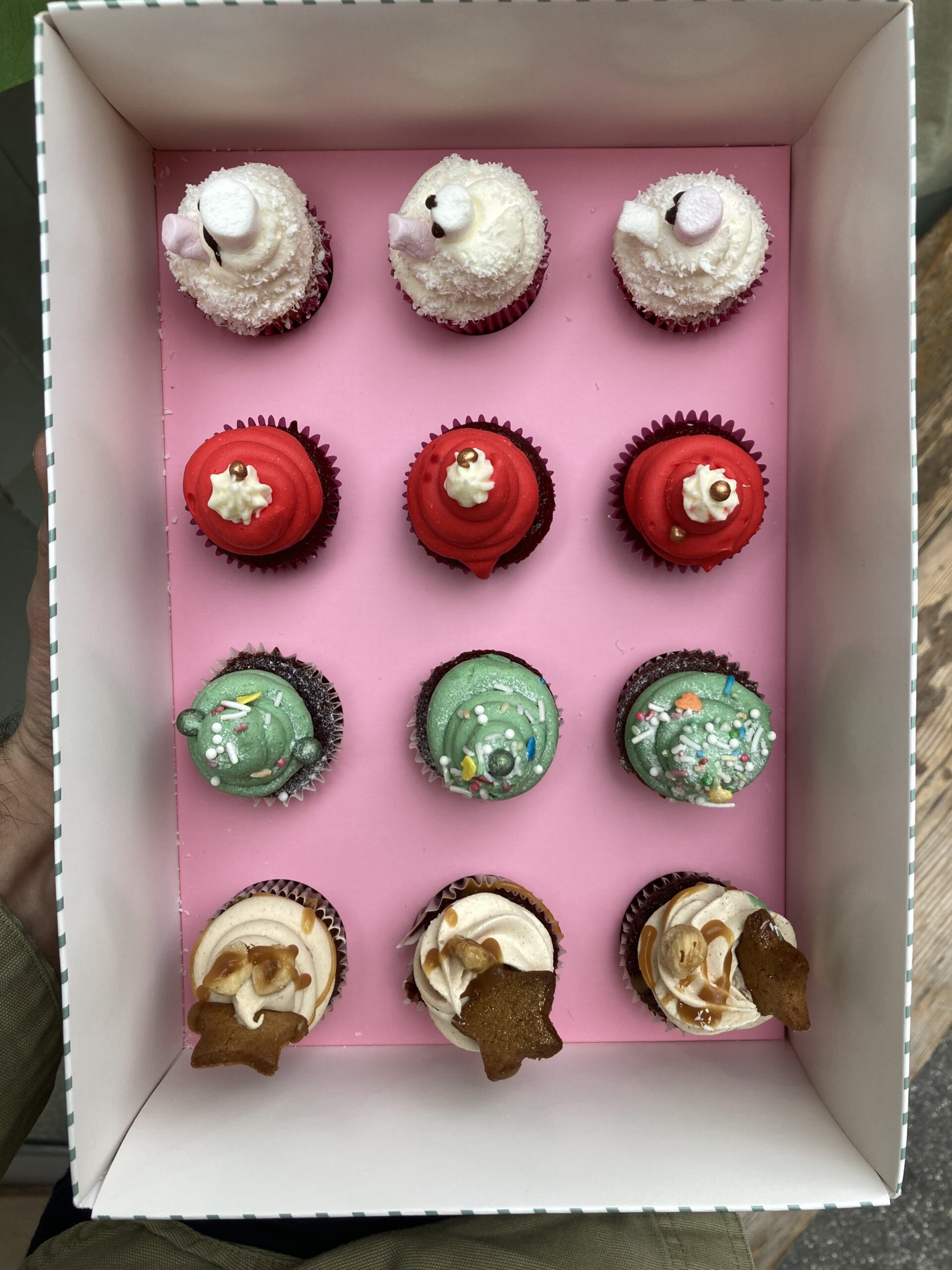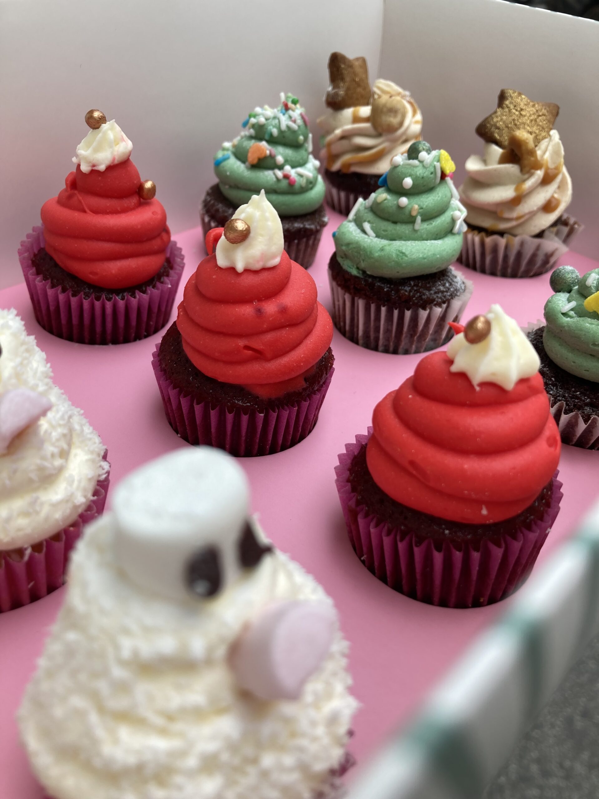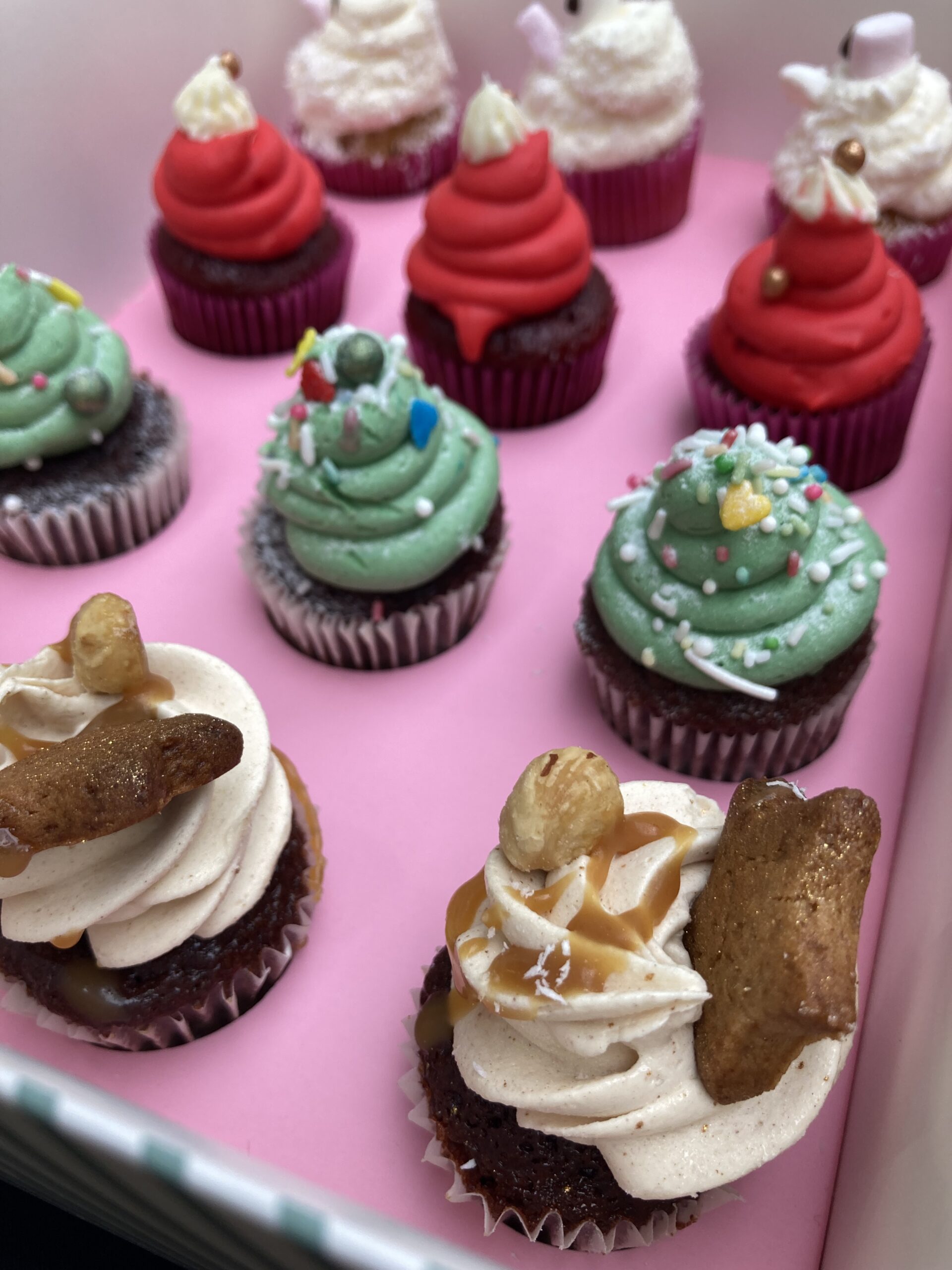 Boîte de 12 mini cupcakes de Noël – mélange de nos cupcakes : red velvet , chocolat praliné, pistache-chocolat, citron-coco. 28 euros
