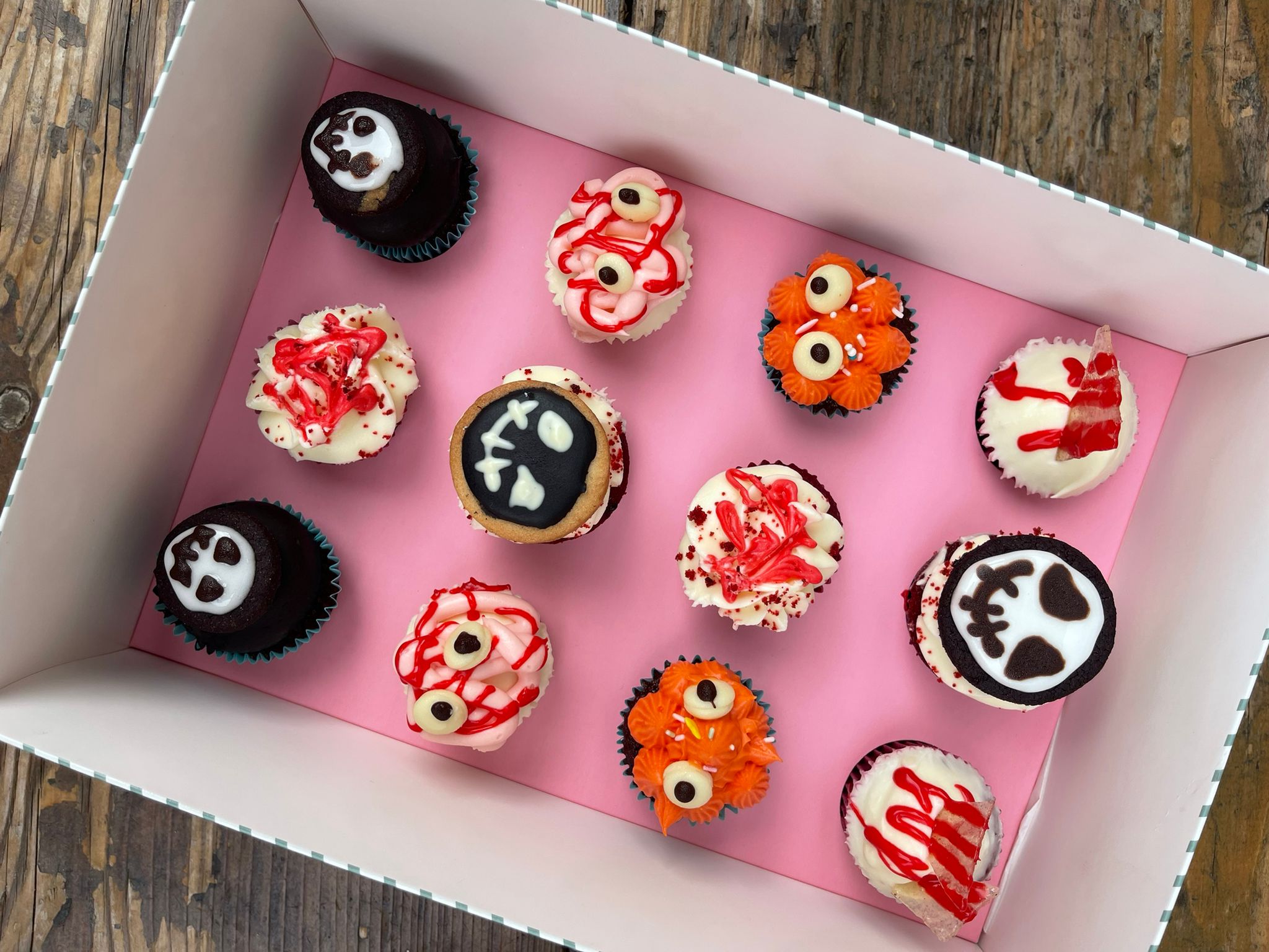 Boîte de 12 mini cupcakes mélange de nos cupcakes : redvelvet , chocolat, peanut butter caramel, citron vanille. 28 euros